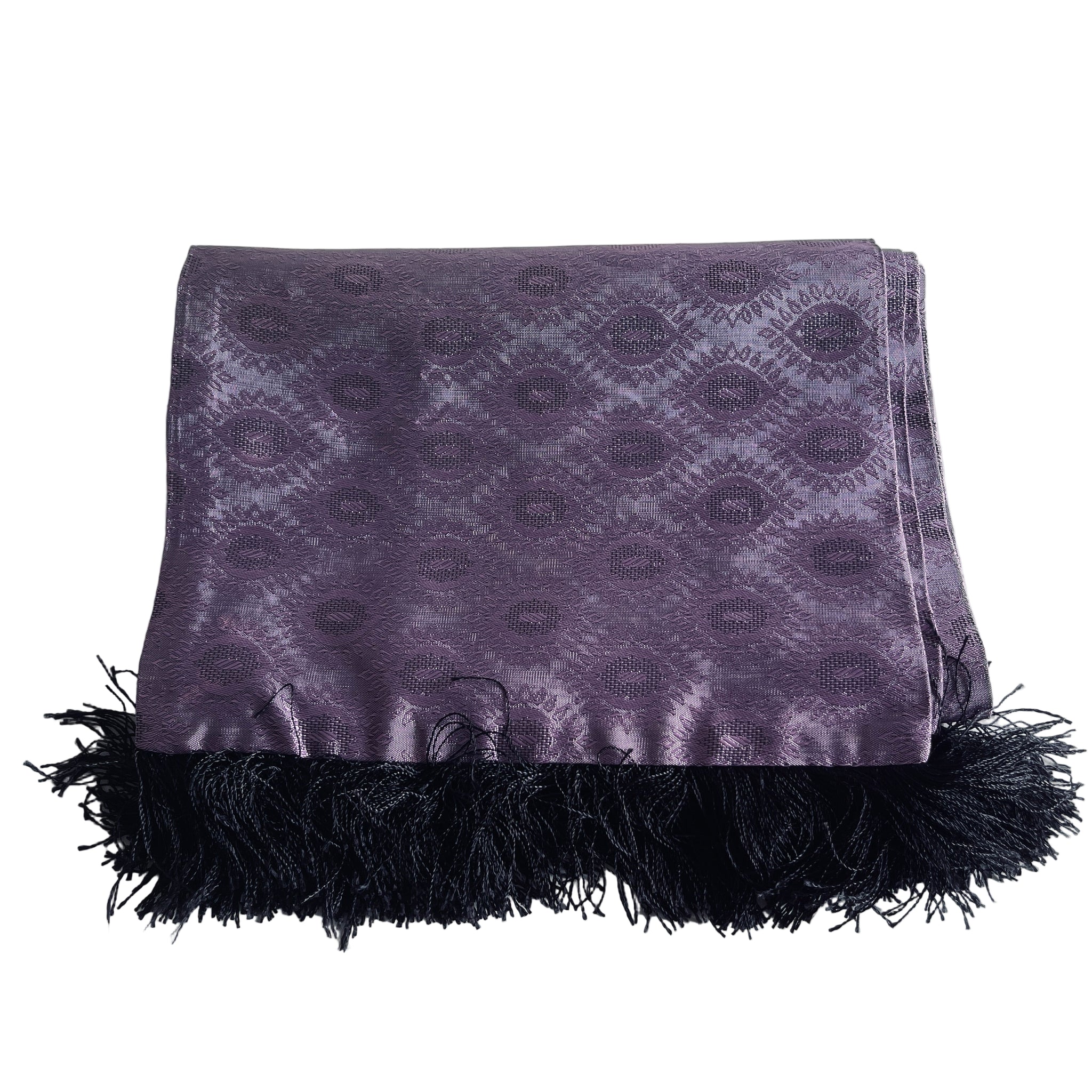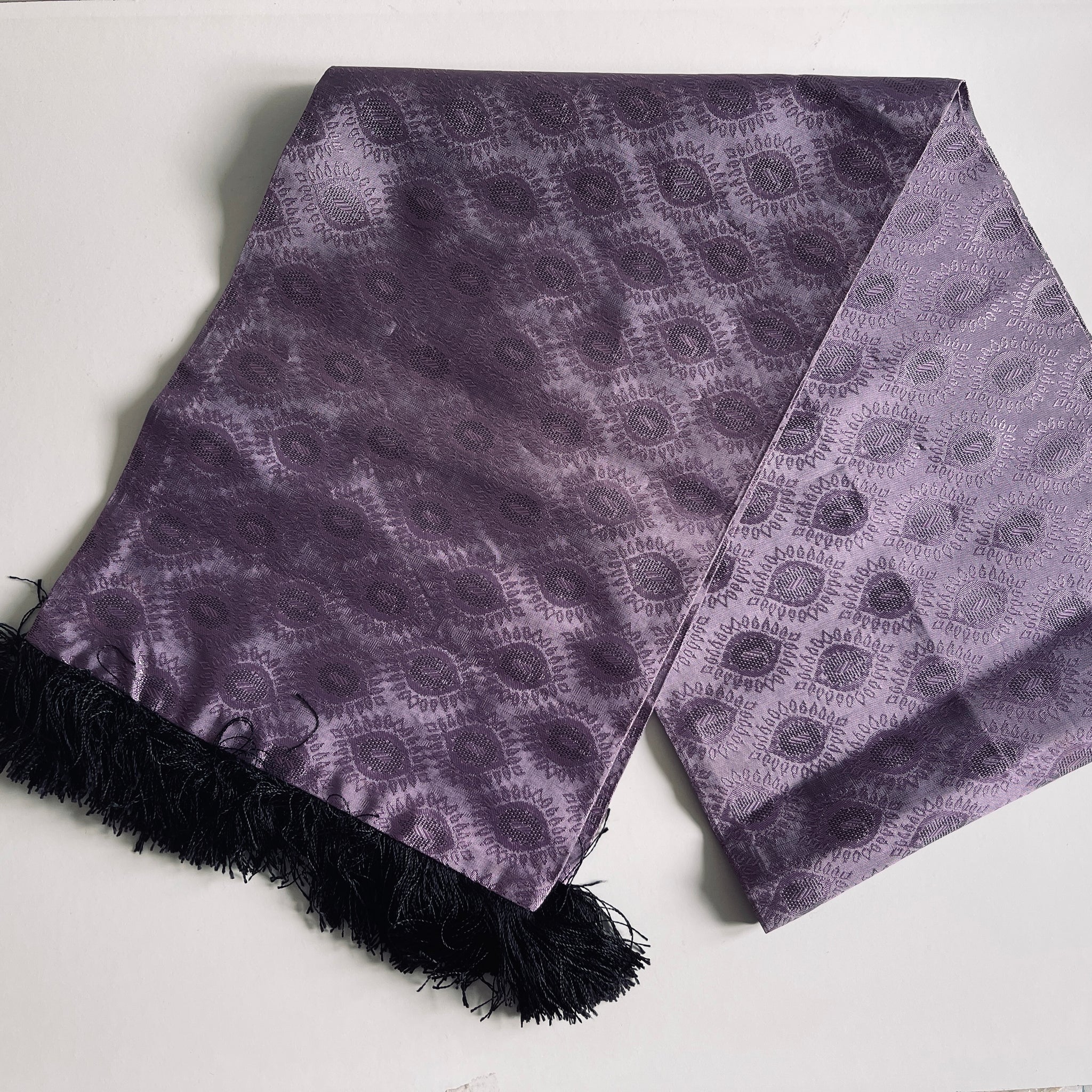 A striking 70s vintage long length double layer silky gentleman's scarf in a rich lavendar purple with a black fringe. There is no brand label but is of excellent quality and in pristine condition, looks unused. Could be dressed up or down to look smart casual or uber smart for dinners with a tuxedo as dress code. No brand label but it's a silky feel and appears to be of excellent quality.