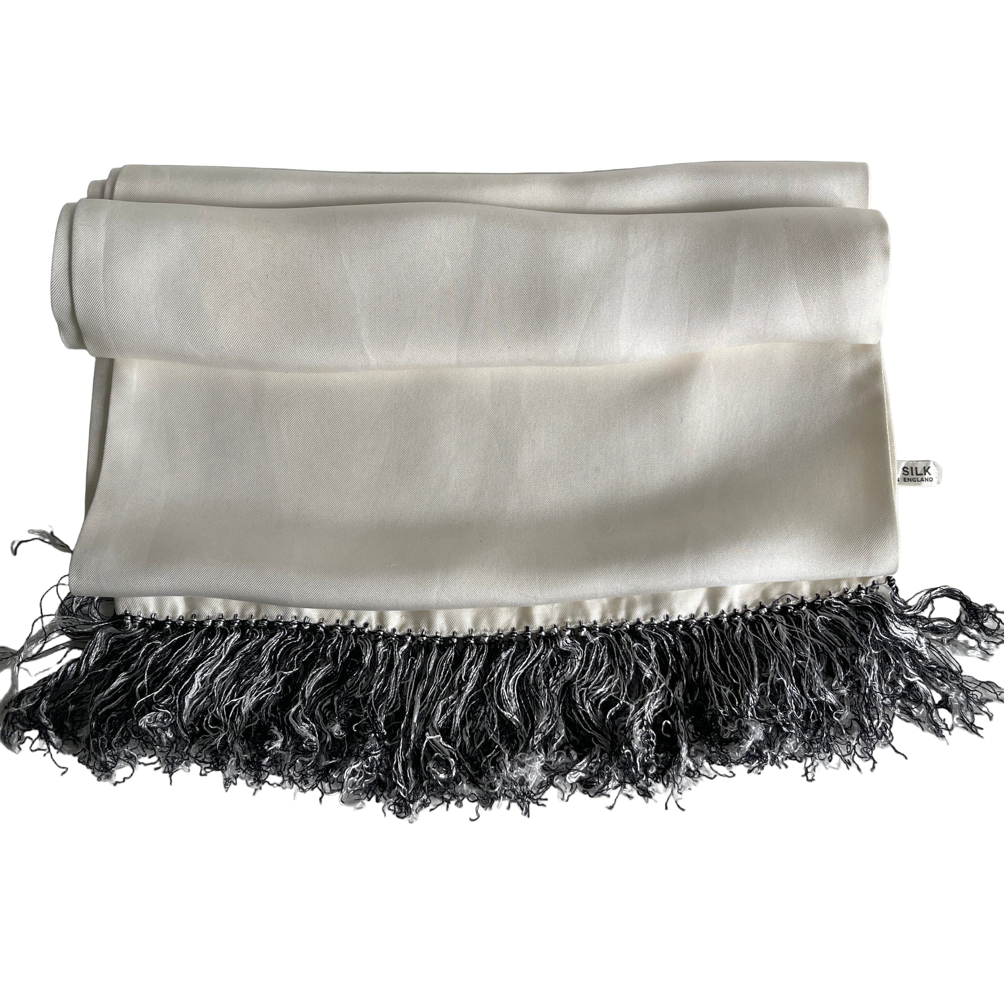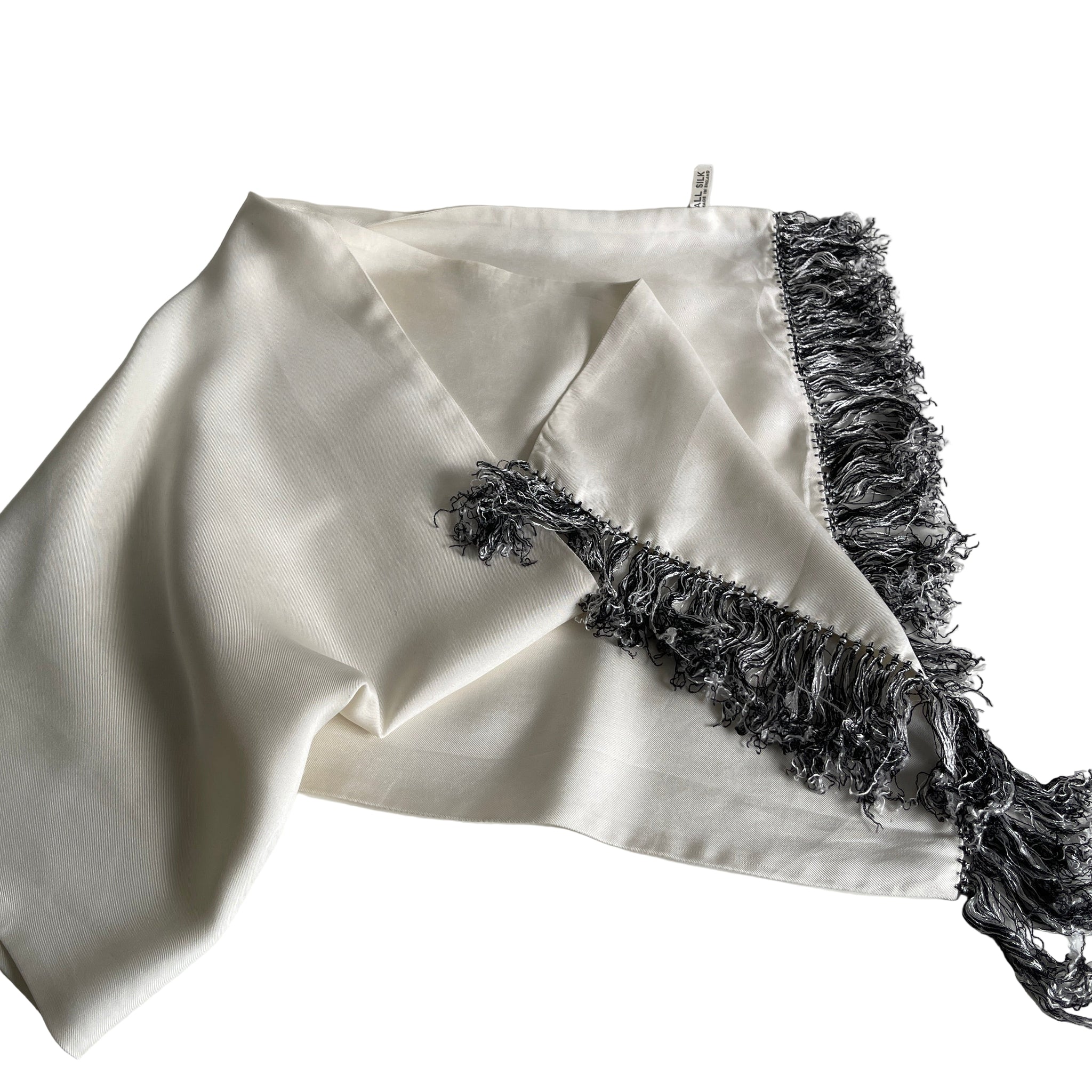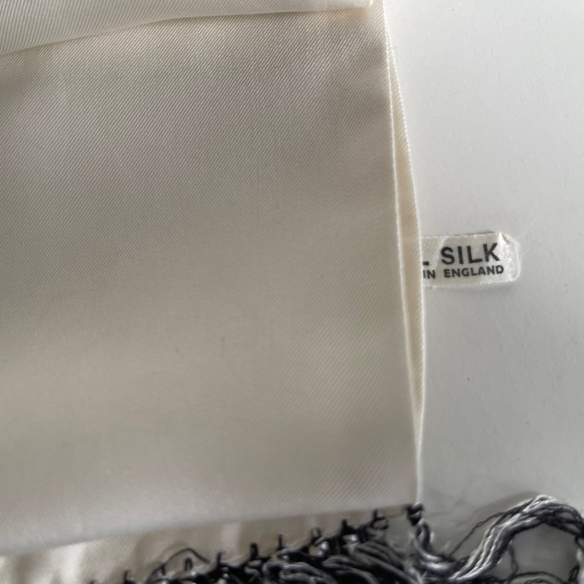 This is a super, 50s/60s vintage long length double layer pure silk gentleman's dress scarf in white with a black and white fringe. There is no brand label but is of excellent quality with the label confirming it is silk remains stitched into the hem. It is in very good condition looks seldom used with no marks or stains just a vague trace of foxing and watermark when held up to the light. No brand label but it's good quality and made in England.