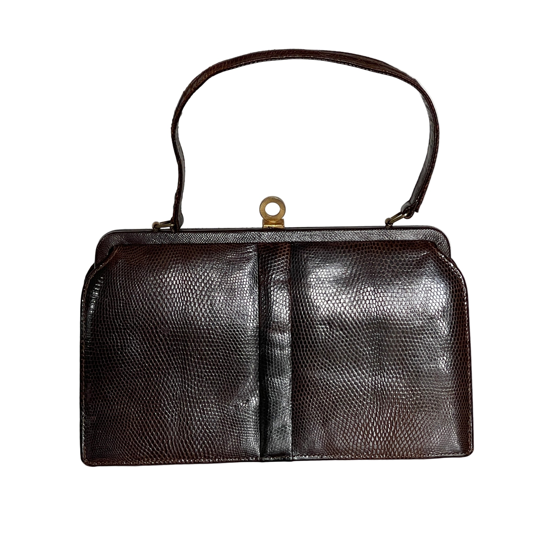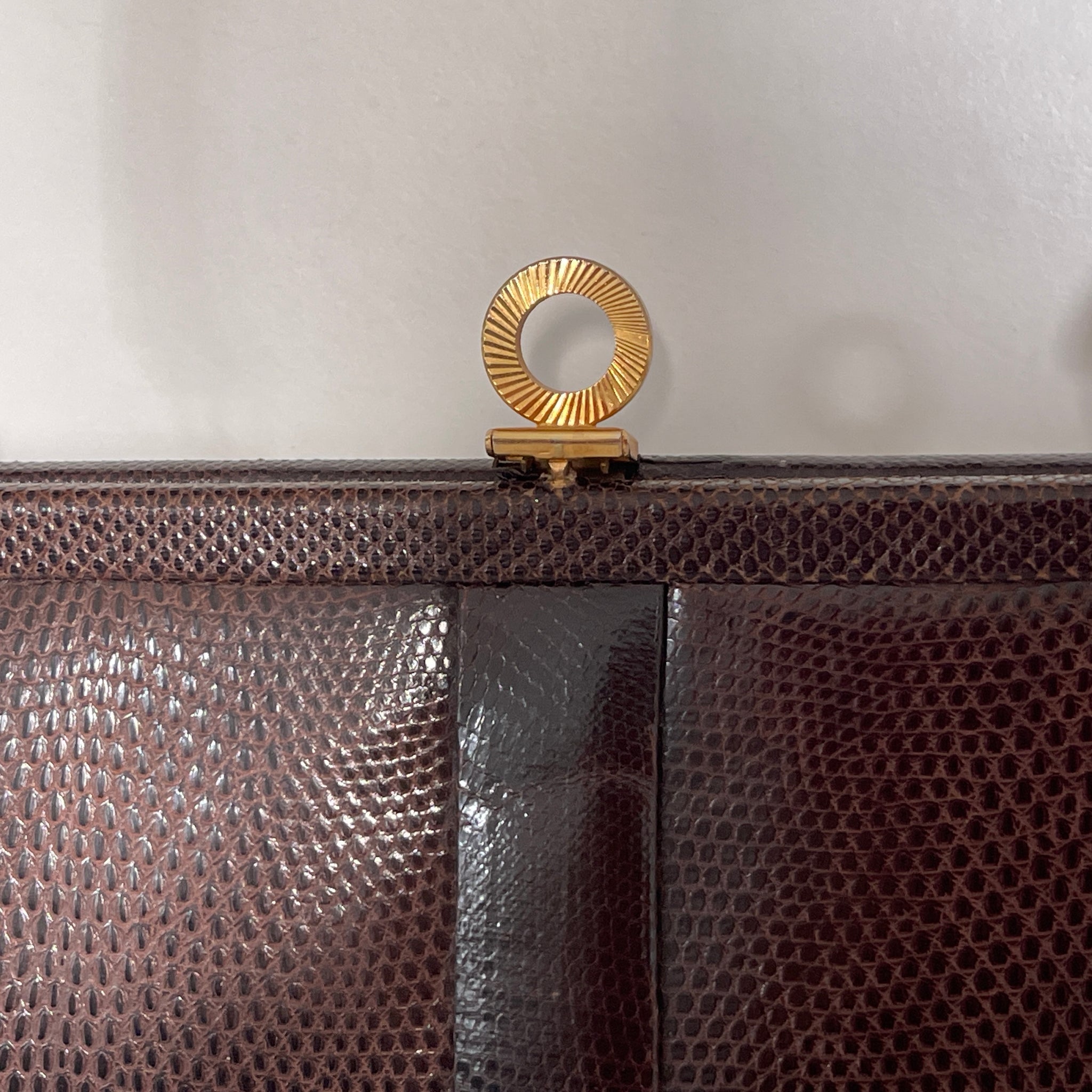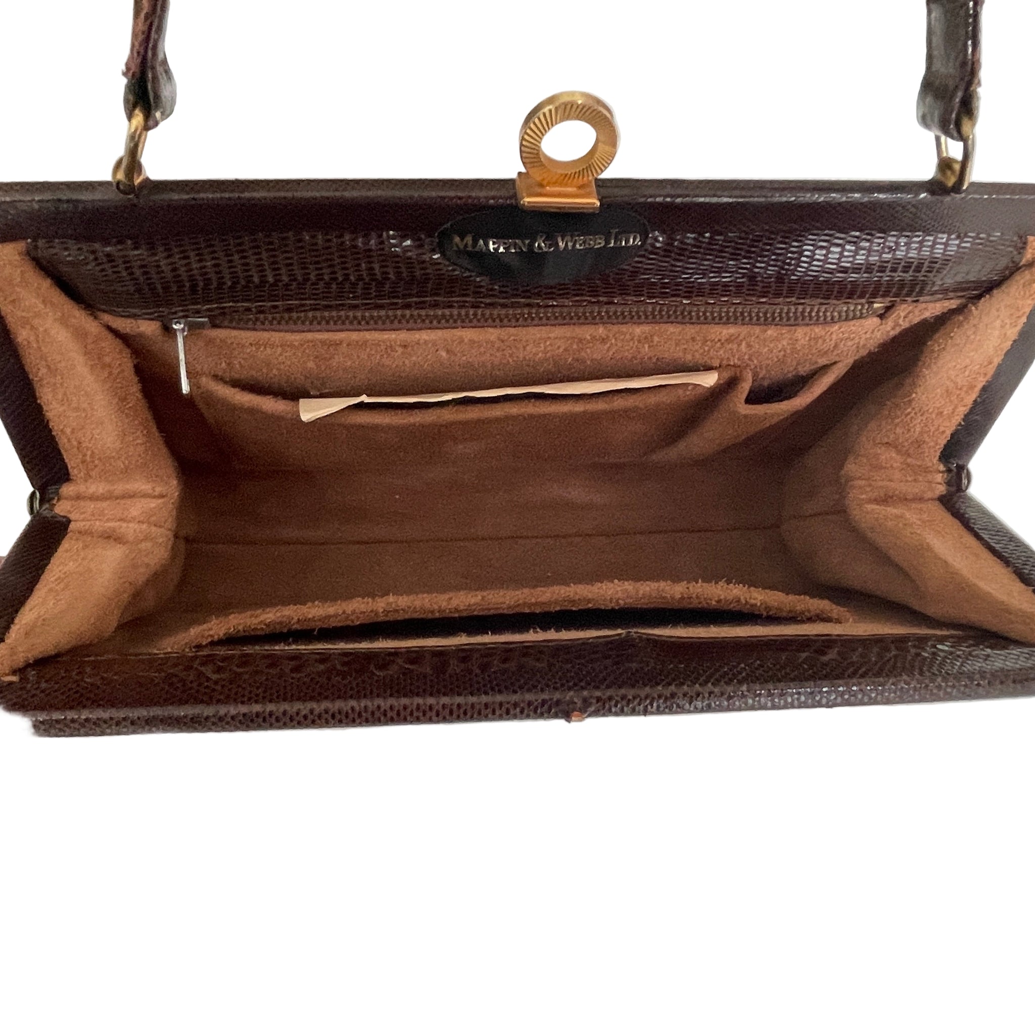 This is a beautiful handbag from sought after brand Mappin and Webb, the world renowned company which holds several Royal warrants but no longer sells these classic handbags. This is one of the larger handbags, in pristine condition in a rich dark chocolate brown. The lizard skin has a very glossy patina and has obviously been extremely well looked after. There is no damage or wear at all to the exterior of the handbag, including the handle which looks unused. The handbag is the ame both sides with a pleat down the centre. The gilt clasp very unusual and attractive, is firm and closes with a very satisfying click. The tan suede lining is clean and in excellent condition. The care card for the lizard skin is still with the handbag and the Mappin & Webb label still attached to the lining.