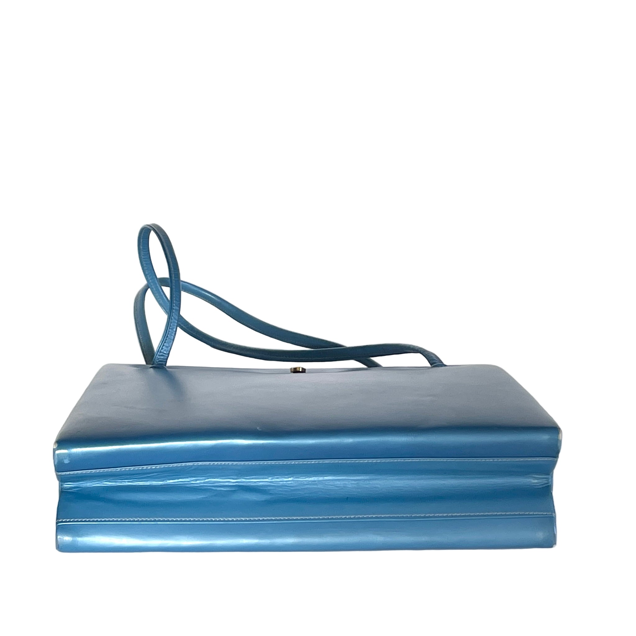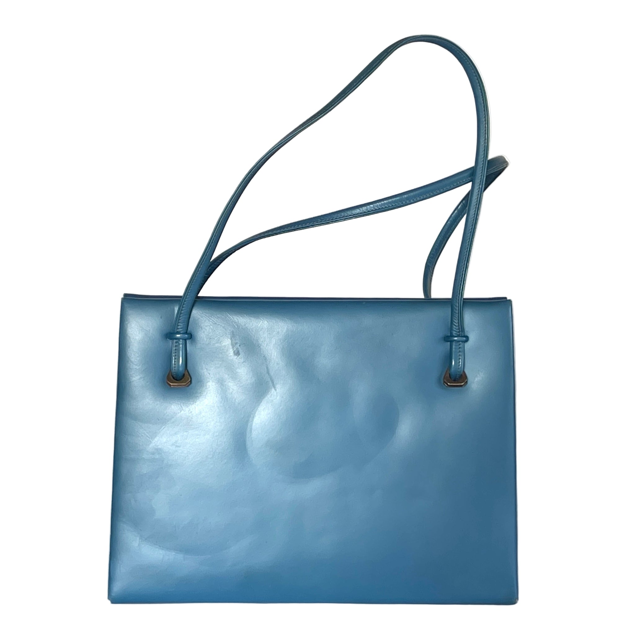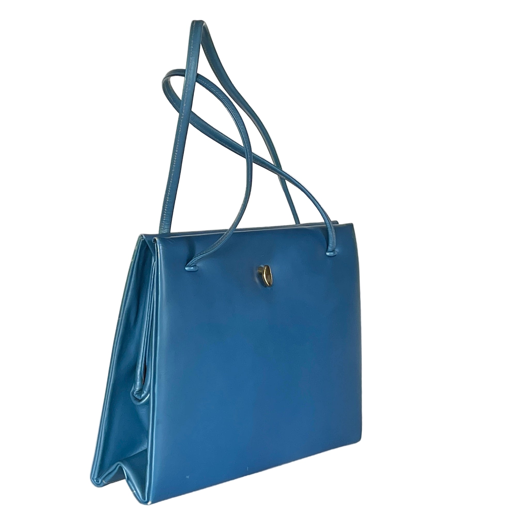 This is an absolutely exquisite handbag, in a rare deep blue pearlescent leather finish from Rayne, a high end renowned brand which held a royal warrant from the late Queen Elizabeth and also made the shoes for her Majesty's wedding in 1947. So if the brand was good enough for HM the Queen... This is in almost pristine condition, looks infrequently used and well looked after. It even has its original fabric dust bag! There are very minor indentations to the rear which are from the handles being stored against the bag, this will lessen with warmth, use and the handles not pressing against the leather. There is a pinpoint loss of colour to the bottom corners of the bag, visible on close inspection. The dark gilt, simple and elegant lozenge shaped lift up clasp is still shiny with no loss of gilt and no tarnish. The slim rolled twin handles are uncreased, look unused. The handbag is lined in a toning blue silk with slip pockets, a zipped pocket and a fitted key ring and it still retains a little matching pouch for change. The lining is in excellent clean condition, looks unused. The Rayne label is attached to the lining.
